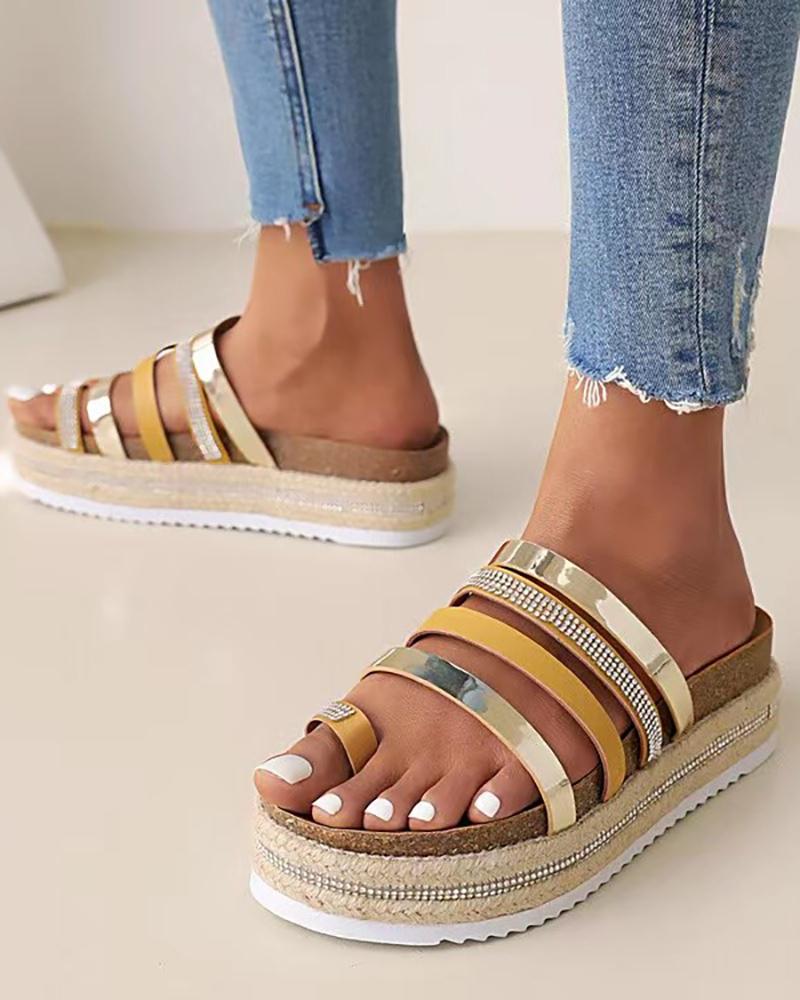 Multi Strap Rhinestone Toe Ring Platform Slippers, Gold