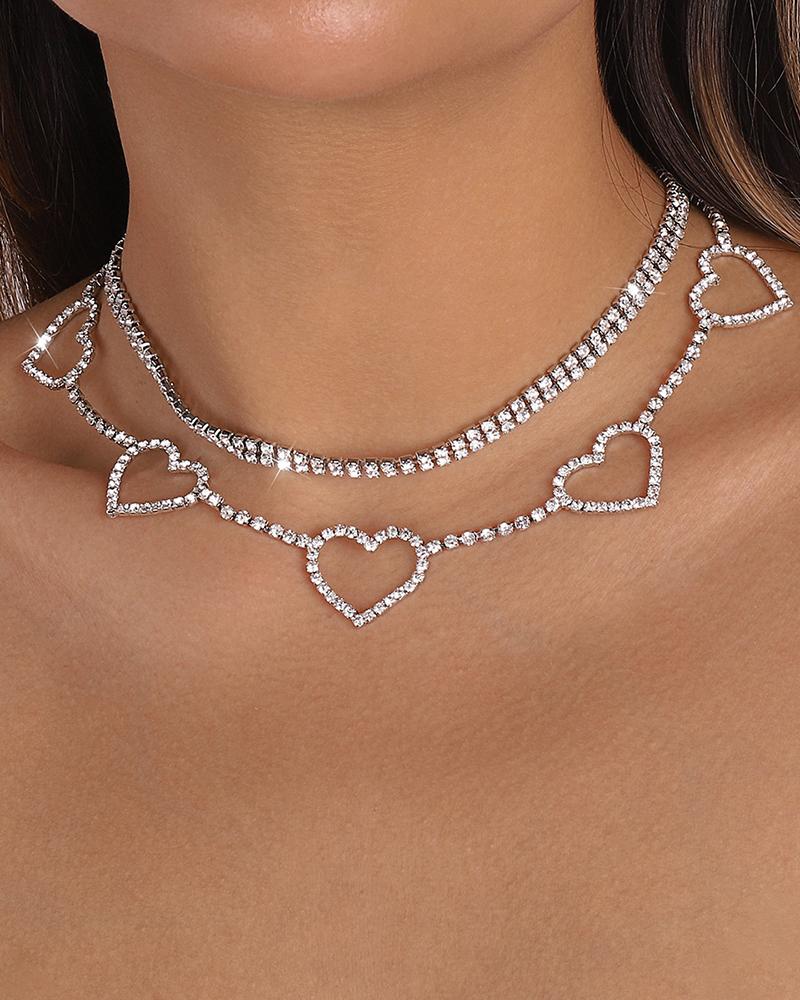 Multi-layer Rhinestone Hollow Out Heart Pattern Choker, Silver