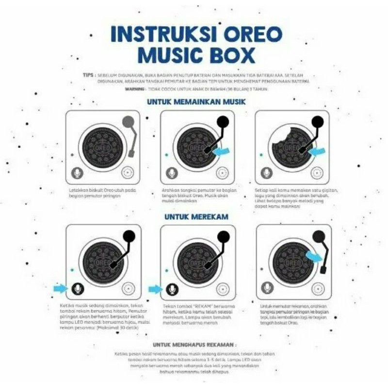 Letakan Oreo pada bagian tengah kotak musik untuk mendengar musik Oreo yang menyenangkan. Musik akan berubah untuk setiap gigitan pada Oreo. Kamu juga bisa merekam pesan atau lagu ketika mengaktifkan Oreo Music Box.