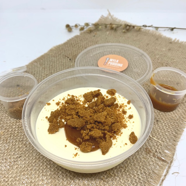 Vanilla super jiggling mylk pudding with butterscotch sauce and Lotus Biscoff crumbs