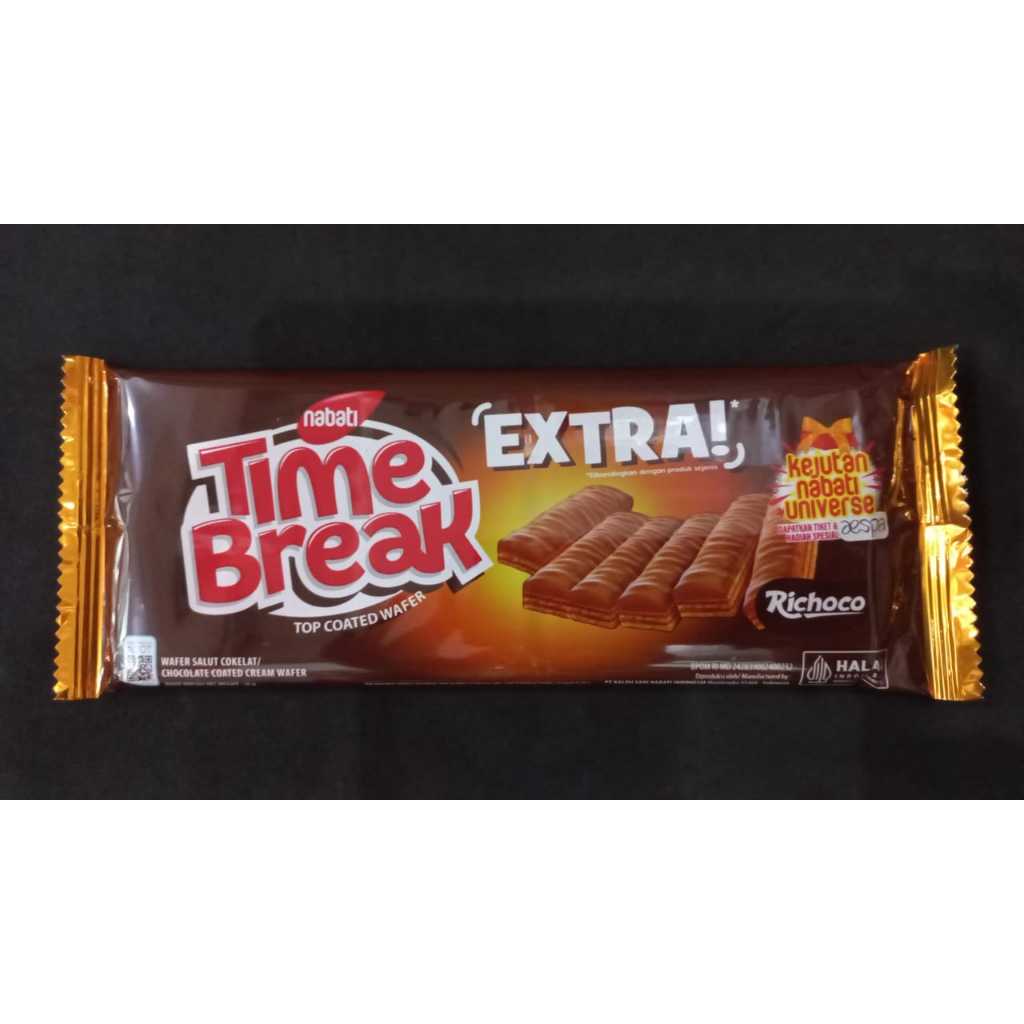 Nabati Time Break Extra Richoco Merupakan wafer salut cokelat renyah dengan inovasi baru dan pastinya enak. Nabati Time Break adalah wafer dengan berlapis coklat yang enak ditambah balutan krim coklat yang nikmat, pasti buat harimu menyenangkan. Coba, dan rasakan kelembutan wafer berbalut coklat yang tebal.