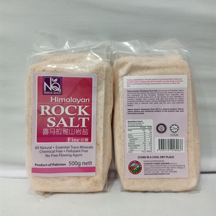 \Rock Salt merupakan Garam Organik yang berasal dari Pegunungan Himalaya. Kelebihan Rock Salt dibandingkan Garam Biasa adalah Rock Salt mengandung semua unsur-unsur yang bermanfaat bagi tubuh. Rock Salt mengandung 84 jenis mineral, sama seperti yang terkandung dalam tubuh kita (dengan tingkat kepekatan yang sama sehingga berfungsi baik menyeimbangkan fungsi-fungsi tubuh) dan sama dengan mineral yang terkandung dalam air zam-zam. Hal ini berbeda dengan Garam Biasa yang melibatkan proses pembersihan menggunakan bahan kimia sehingga sebagian besar mineral yang ada di dalam Garam Biasa telah ikut terlarut/terbuang dalam proses pembersihan tersebut. Rock Salt/Garam Himalaya ini tidak bisa diproses dengan cara modern karena terbntuk jutaan tahun yang lalu tanpa dicampur dengan bahan kimia apapun. Beberapa manfaat yang dapat diperoleh dengan mengkonsumsi Rock Salt adalah: 1. Mencegah hipertensi yang dapat mengakibatkan serangan jantung stroke. 2. Mencegah timbulnya osteoporosis 3. Mencegah penyakit kencing batu/batu ginjal Rock Salt juga cocok dikonsumsi oleh bayi balita yang baru belajar mengenal garam sebagai zat tambahan dalam makanan. KAMI MENYEDIAKAN PRODUK ASLI HIMALAYAN ROCK SALT DARI PAKISTAN, HATI-HATI DENGAN SUPPLIER LAIN YANG MENJUAL DENGAN HARGA MURAH YANG TIDAK MENGGUNAKAN KEMASAN ASLI DARI NATURE QUEST.