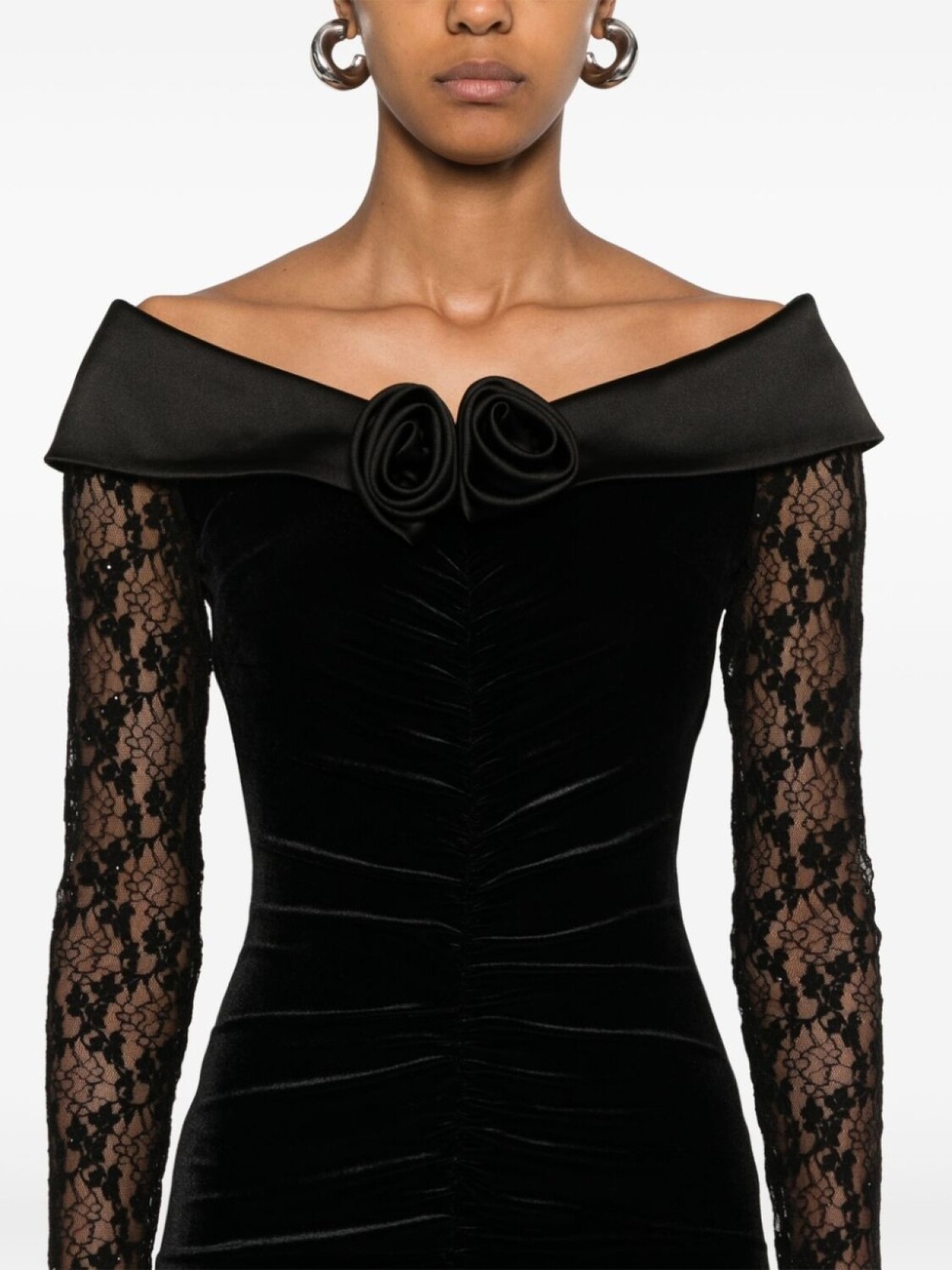 Подробнее о товаре: • черный • эластичный материал • бархат • атласная вставка • кружевные вставки • потайная застежка на молнии сзади • вырез-лодочка • цветочная аппликация • драпировка • длинные рукава • юбка макси • модель без подкладки • прямой подол