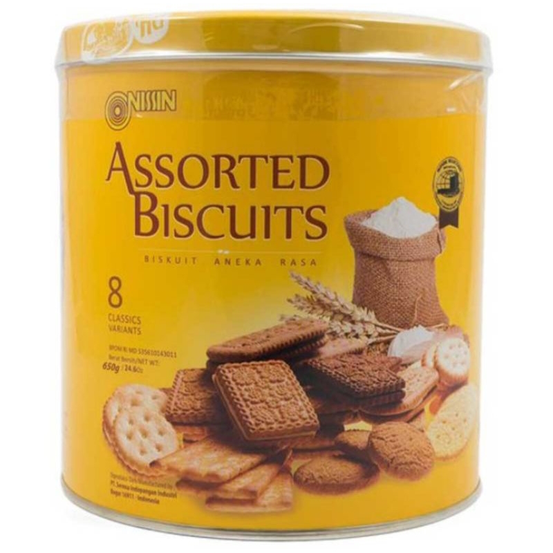 NISSIN Assorted Biscuits Kaleng 650 g adalah sebuah paket biskuit berbagai jenis dan varian persembahan nissin. Dibuat menggunakan bahan-bahan pilihan, sehingga menghasilkan biskuit dengan kualitas tinggi. Diproses dan diolah menggunakan teknologi modern dan proses yang higienis, menjadikan seluruh varian biskuit produksi NISSIN memiliki rasa yang lezat. Dalam satu kemasan terdapat delapan jenis varian biskuit seperti biskuit sandwich, biskuit cokelat, biskuit malkist, dan varian lainnya. Dikemas menggunakan tabung kaleng dengan ukuran 650 gram berwarna kuning untuk menjaga kualitas dan rasa biskuit. Cocok dijadikan buah tanggan saat pulang ke kampung halaman atau dijadikan stock cemilan dirumah untuk menyambut tamu. Segera beli NISSIN Assorted Biscuits 650 g sebagai kue kering untuk keluarga anda.