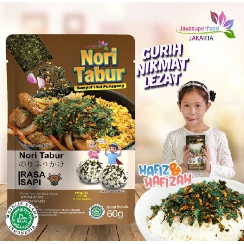 Nori Tabur ini terbuat dari perpaduan rumput laut panggang, bawang goreng dan wijen yang digunakan sebagai tambahan atau taburan untuk menu makanan seperti Nasi Goreng, Nasi Kepal, Mie Kuah, Bubur, dll