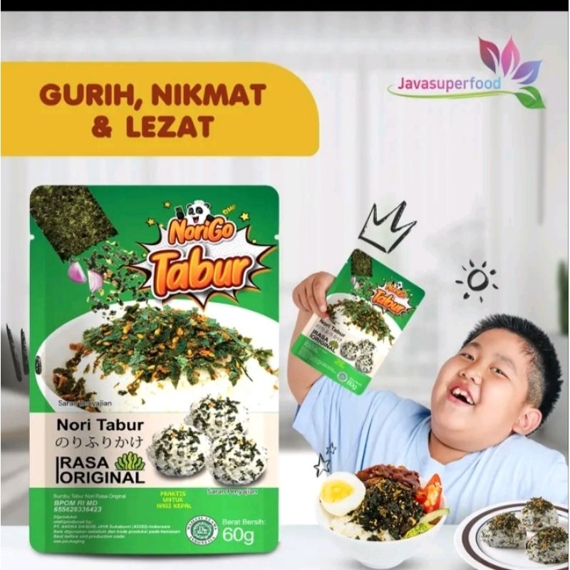 Nori Tabur ini terbuat dari perpaduan rumput laut panggang, bawang goreng dan wijen yang digunakan sebagai tambahan atau taburan untuk menu makanan seperti Nasi Goreng, Nasi Kepal, Mie Kuah, Bubur, dll