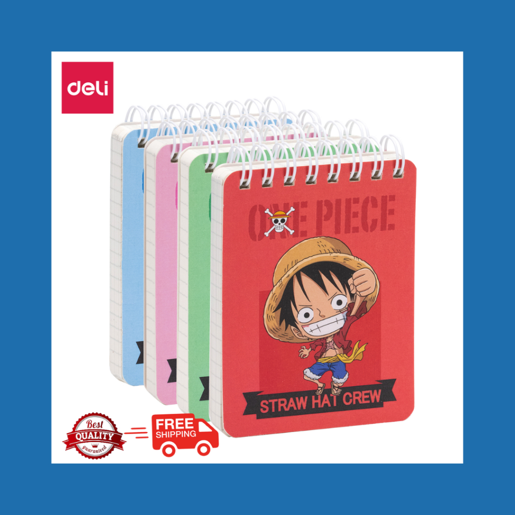 Notebook spiral merek Deli dengan cover motif ONE PIECE bertekstur linen. Isi 100 lembar kertas bergaris. Menggunakan kertas warna beige (gading / putih kekuningan). Harga tertera merupakan harga satuan.