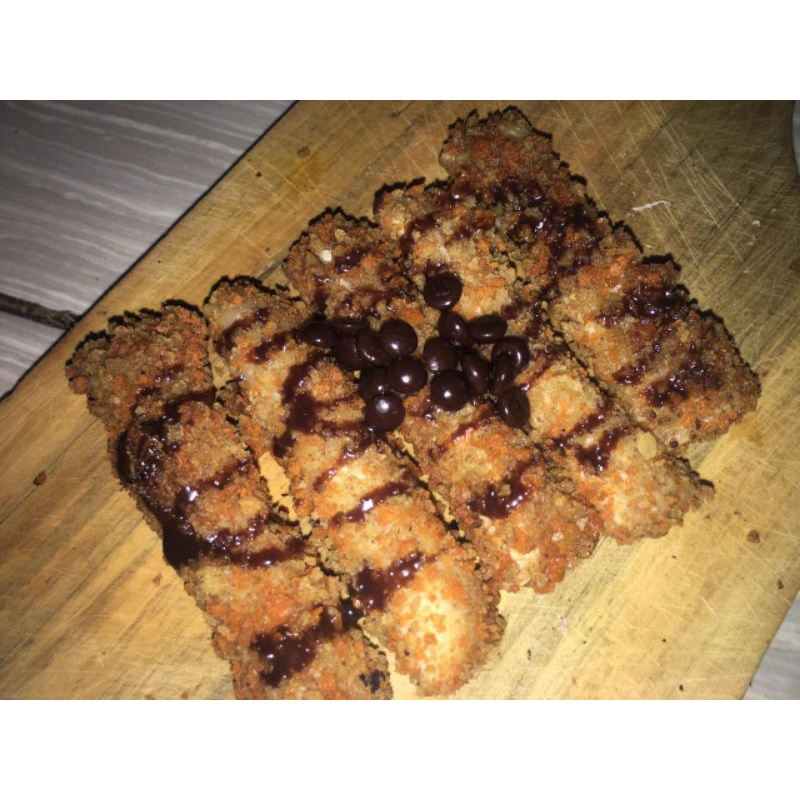 keju/coklat diroll dengan kulit pangsit, lalu dibalut tepung dan tepung roti! rasanya gurih ah mantap wajib cobainnn