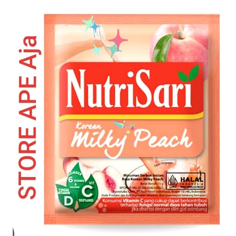 NutriSari Milky Peach adalah minuman serbuk rasa peach yang mengandung sari buah peach dan susu. Minuman ini mengandung vitamin C, vitamin D, vitamin A, B1, B3, B6, dan E, serta mineral kalsium dan fosfor.