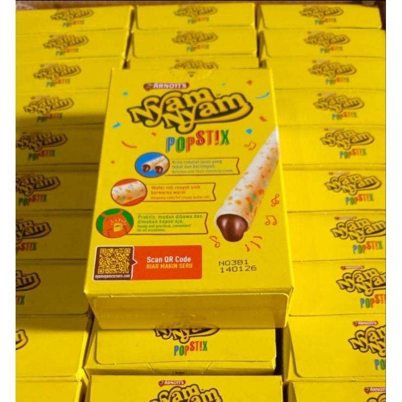 Nyam Nyam Popstix 48gr Nyam Nyam Pop Stix merupakan wafer roll dengan filling coklat yang lezat, cocok untuk kamu bawa ke sekolah atau dinikmati untuk cemilan. Jadikan hari lebih ceria bersama Nyam-Nyam Pop Stix.