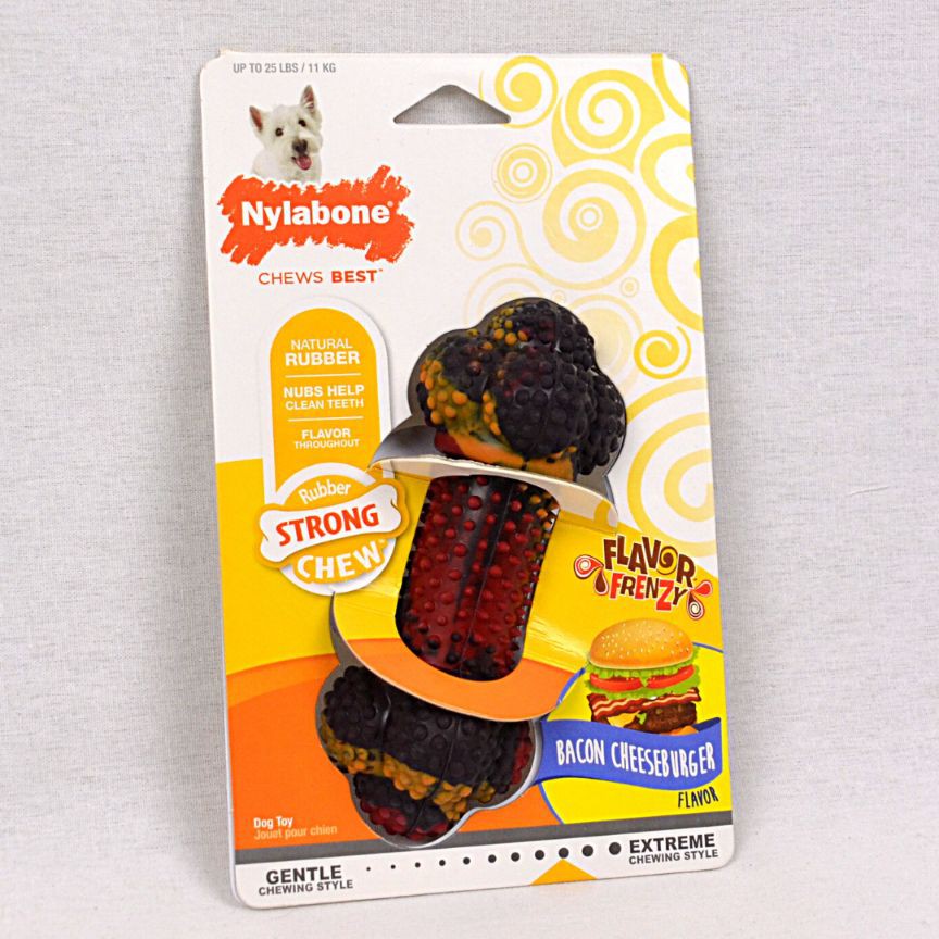 This Product Measures: 7.5L x4.5W x1.75H.DescriptionPowerful chompers have finally met their tasty match with the NylaboneRubberChew Flavor Frenzy Bacon Cheeseburger Flavored Dog Chew Toy. Designed tohold up to tough chewers, this chew toy gives bored dogs something to sink theirteeth into, while the nubs help to clean them—offering two convenient uses inone delicious package. And because your dog is always begging for a bite of yourfood, it’s made to taste just like the real deal. Try a different flavor inevery room!Key Benefits * Non-edible long-lasting dog toy is made to occupy strong chewers to prevent destructive chewing. * Strong chewing style keeps dogs busy, happy, and satisfied with a bacon cheeseburger flavor throughout. * Inspired by the indulgent people food that dogs wish they could eat with zero calories. Try every flavor! * Easy-grip natural-grade rubber is designed for chewers who prefer some flex and give. * Recommended by veterinarians. Helps to promote dental stimulation, which is good for oral health.Every dog plays differently and, since not all toys are created equal, it’salways best to keep a close watch on your pup in case things get ruff.Supervised play will help toys last longer and most importantly keep your palsafe. No dog toy is truly indestructible, so always remove the toy from playtimeif pieces begin to break off.