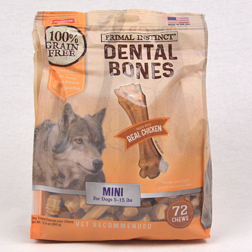Dog dental care is essential, but not always easy. Let Nylabone Primal InstinctDental Bones do some of the work–naturally.Each treat is crafted to help clean dogs' teeth by engaging their naturalchewing action, leading to cleaner teeth and fresher breath.Made with real meat, these all-natural, highly digestible dental treats satisfyyour dog’s primal instinct to chew.Your pup won’t even know they are practicing healthy oral hygiene while chewingon this delicious meat flavored bone. Each dog chew treat is 100% grain freewith no wheat, no meat by-products, and no corn.This healthy and flavorful dog dental bone is both vet and dog recommended!IngredientsPotato Starch, Vegetable Glycerin, Gelatin, Natural Flavors, Dried Chicken,Calcium Carbonate, Powdered Cellulose, Lecithin.Guaranteed Analysis.CRUDE PROTEIN10.0% minCRUDE FAT0.5% minCRUDE FIBER8.0% maxMOISTURE15.0% max
