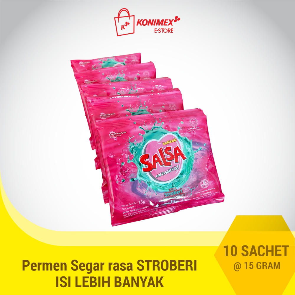 Permen Nano Nano Salsa Stroberi ini dikemas dalam kemasan rentengan dengan jumlah 10 sachet. Tiap sachet nya berisi 15 gram atau setara dengan 6-7 butir permen.