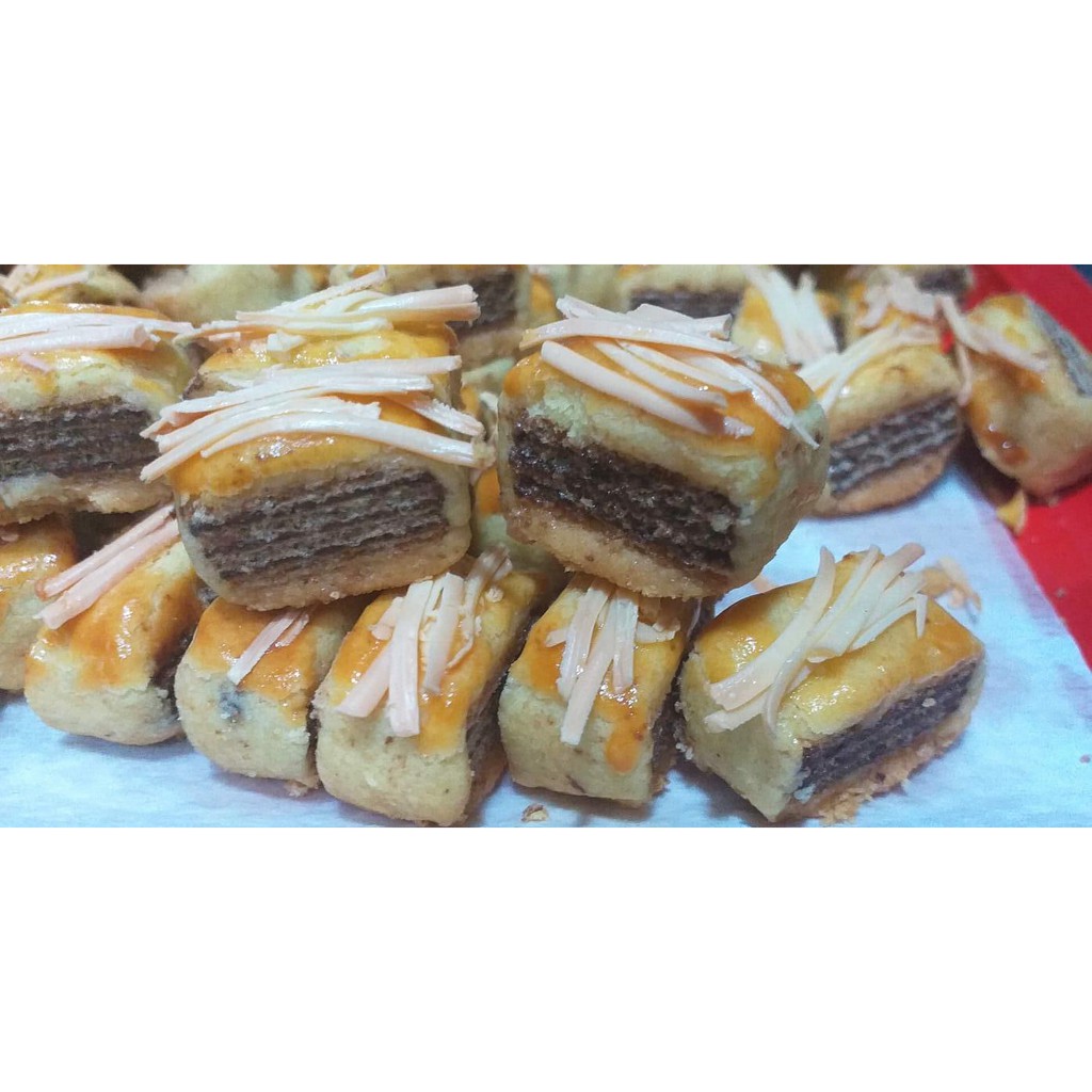 - Dibuat menggunakan Blueband, tepung segitiga biru, tepung maizena, telur, gula halus, susu Dancow bubuk, wafer nissin coklat, keju cheesy.