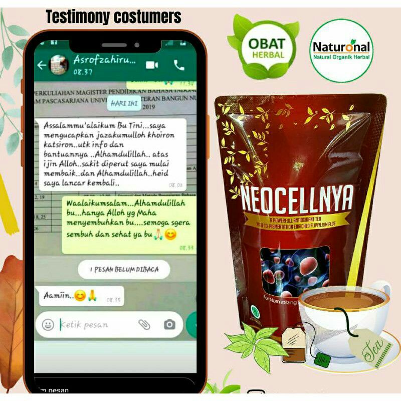 Neocellnya adalah obat herbal berbentuk sediaan teh yang berijin Dinkes PIRT sebagai makanan minuman kesehatan berguna untuk menormalkan sel-sel abnormal melalui respirasi DNA pada siklus sel.