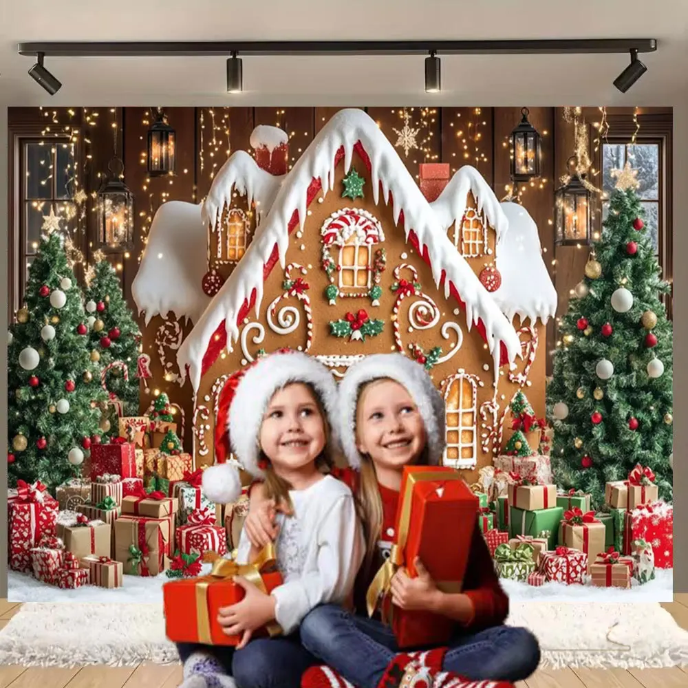 Christmas Party Snowy Gingerbread House Photography Background Glitter Xmas Tree Lantern Gift Booth Kid Winter Birthday Portrait