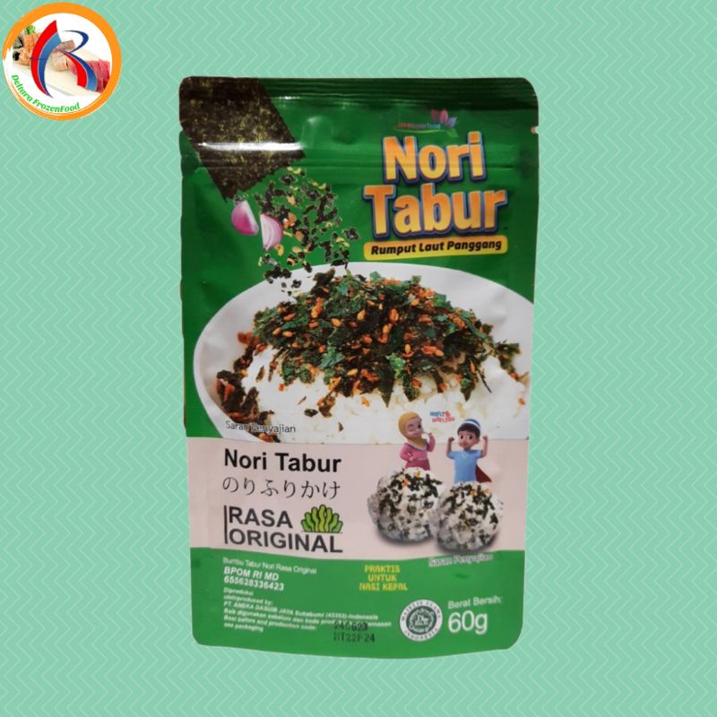 Nori Tabur ini terbuat dari perpaduan rumput laut panggang, bawang goreng dan wijen yang digunakan sebagai tambahan atau taburan untuk menu makanan.