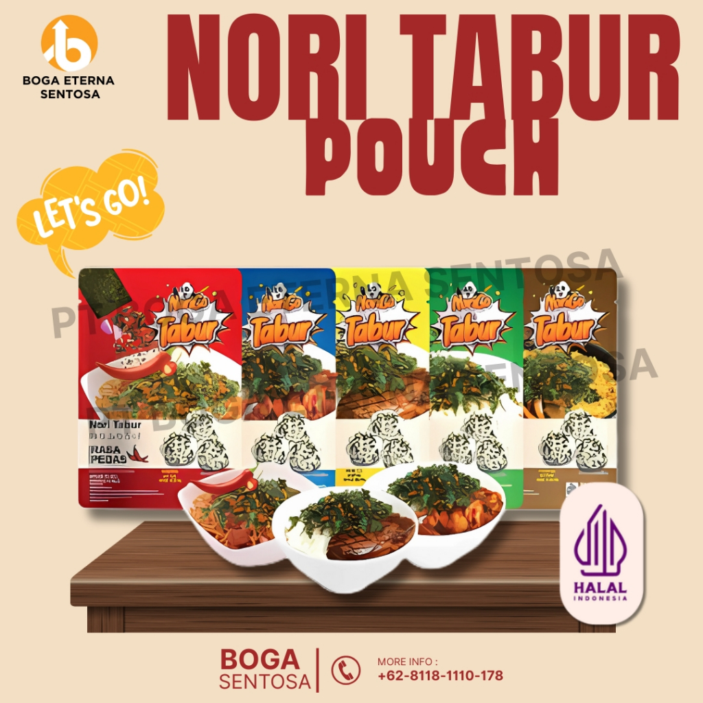 Nori tabur adalah makanan ringan / cemilan rumput laut yang dapat diaplikasikan ke berbagai makanan seperti Nasi Hangat, Mie Instant, Bubur, Nasi Goreng dan berbagai makanan lainnya. Berbentuk pouch ukuran 60g