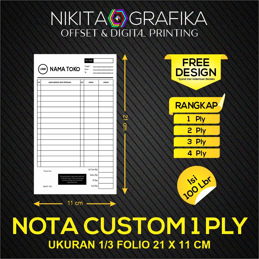 Nota Custom 1/3 Folio 1 Ply 1 Rangkap Nota Surat Jalan Faktur Kwitansi Resep Form