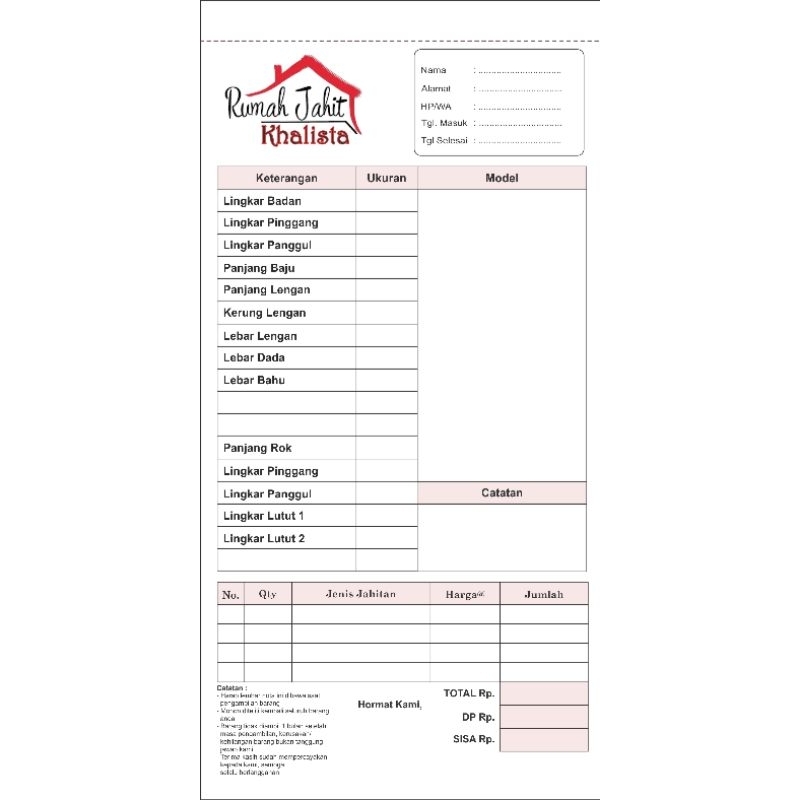 Nota Custom/Nota Jahit/Nota modiste