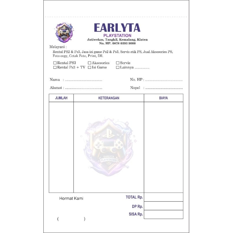 Nota Custom/Nota PS/Nota Rental PS/Nota Sewa Ps/Nota