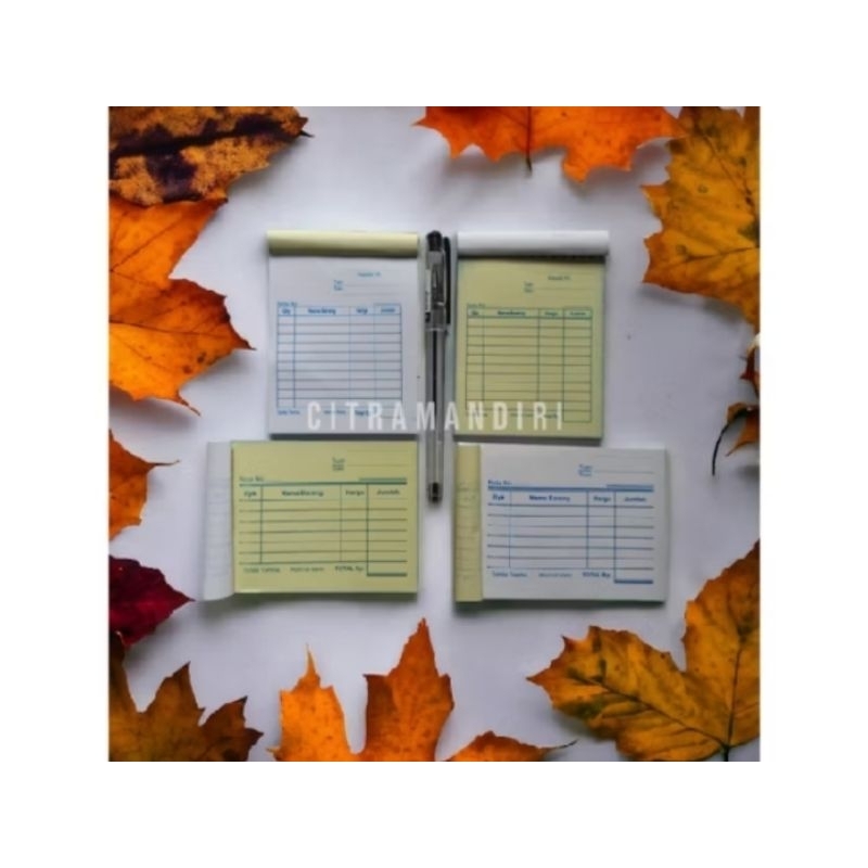 Nota kertas NCR rangkap 2, tanpa harus pakai kertas karbon. Ukuran 8x10cm tulis langsung tebus ke kertas bawah.