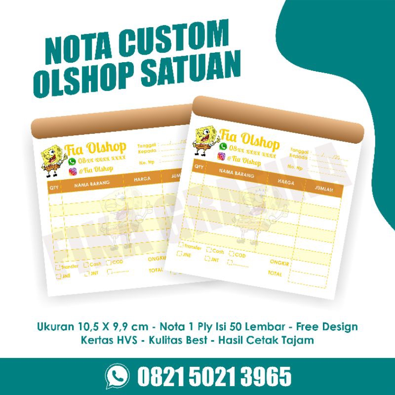 Nota Olshop Custom bisa cetak satuan. deskripsi lengkap ada pada gambar. dimensi ukuran 10x9,5 free design