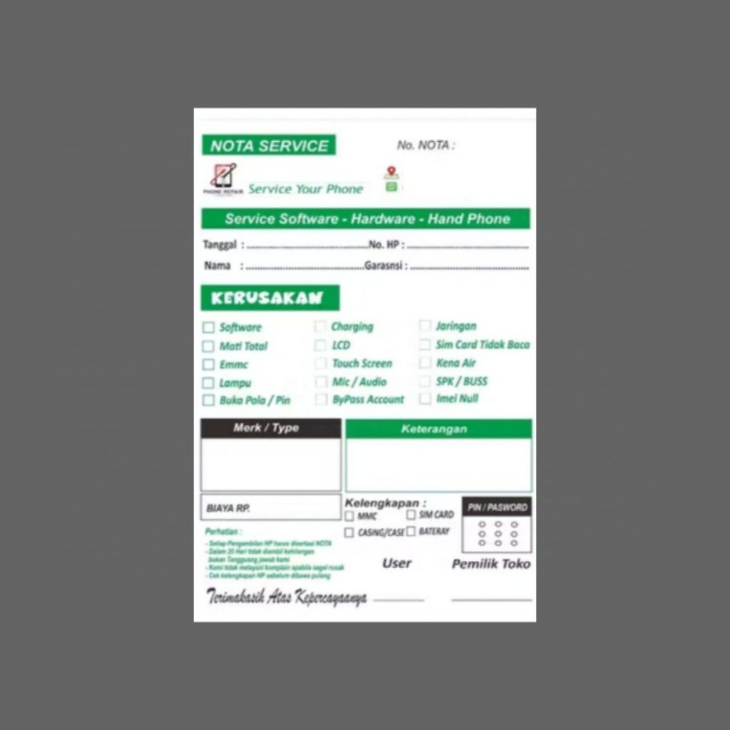 Nota service handphone custom