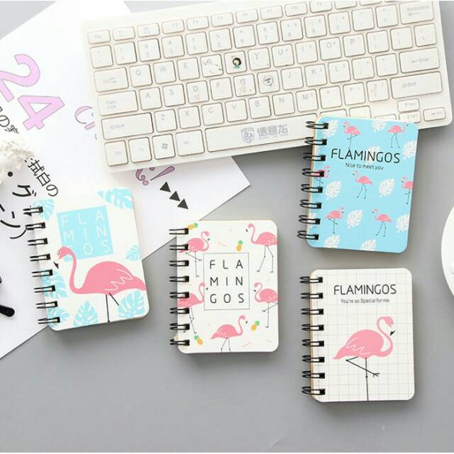 Buku tulis mini spiral Flamingos Daun dan Nanas ini sampul terbuat dari karton, kertas bergaris. Bahan halus dan tebal. Buku tidak mudah lepas, karena dijilid dengan ring. motif Flamingo cute.