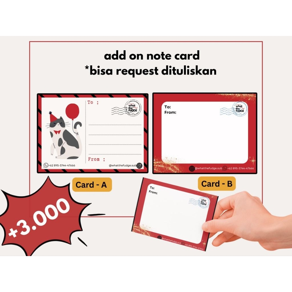 Add ons note card bisa request dituliskan yaa. Request tulisan bisa dimasukin di notes saat checkout atau bisa dm kami untuk request lebih lanjut