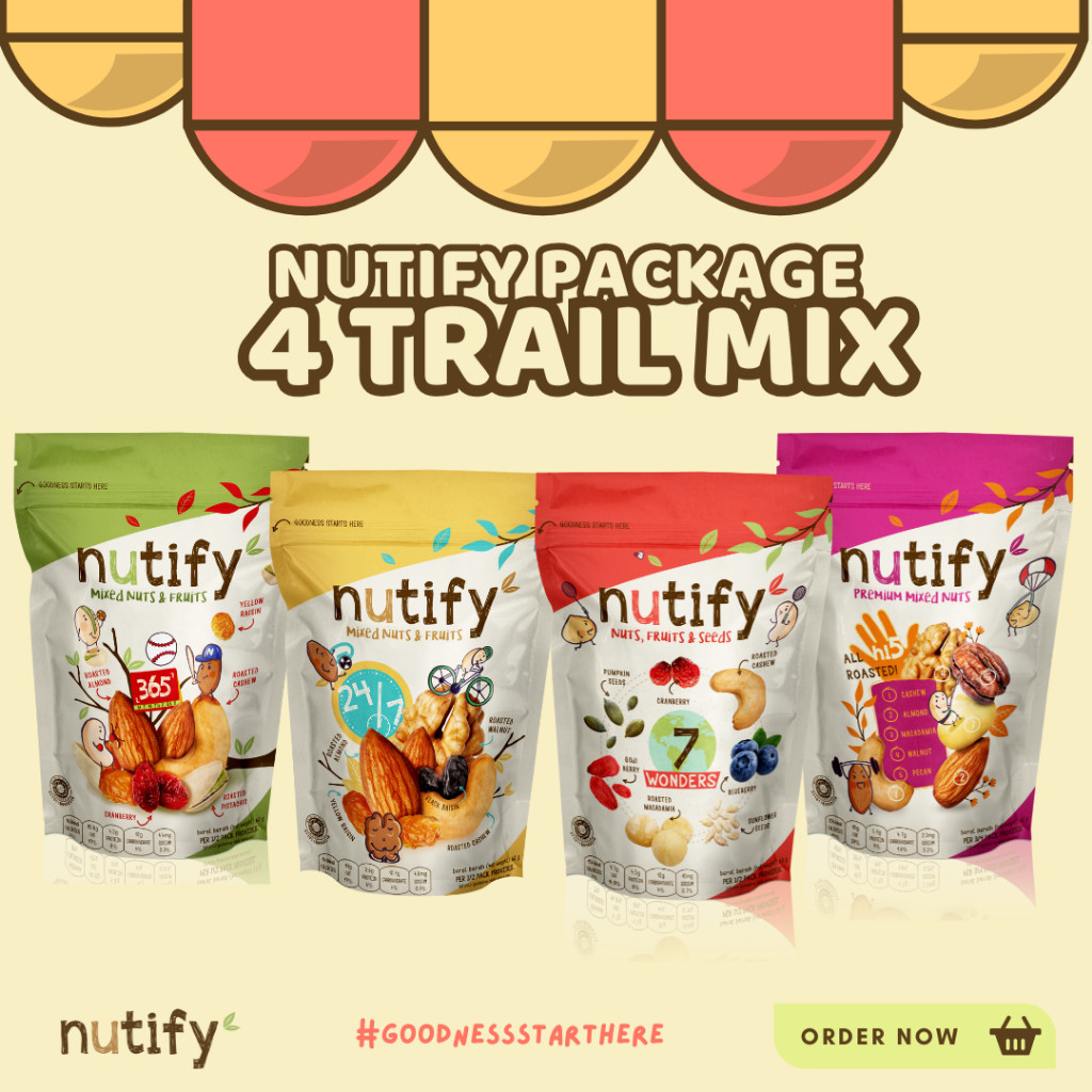 Nutify adalah pionir trail mix atau mixed nuts di Indonesia. Kenapa mixed nuts dan dried fruits? Karena setiap kacang dan buah memiliki keunggulan masing-masing. Mencampurkan kacang dan buah membuat rasanya menjadi gurih, manis, asam dan tidak membosankan, walaupun tanpa penambahan gula ataupun garam. Kamu jadi bisa hidup sehat dengan enak, tanpa mengorbankan citarasa.