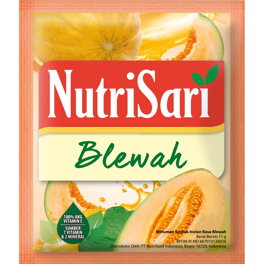 NutriSari Blewah dengan sari buah blewah alami. Memenuhi 100% kebutuhan vitamin C, diperkaya dengan vitamin A, B1, B3, B6, asam folat dan E, serta mineral kalsium dan fosfor. Diolah dengan teknologi tinggi (granulasi dan enkapsulasi) agar kualitas produk tetap terjaga.