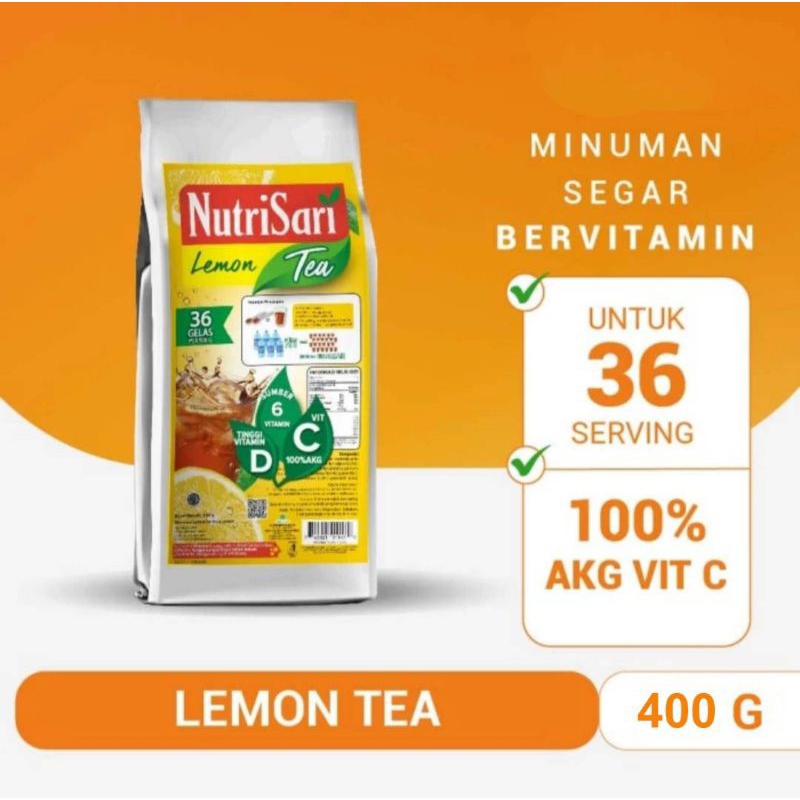 NutriSari Lemon Tea 400 gram merupakan minuman serbuk rasa teh dengan buah lemon yang hadir dalam kemasan refill pack 500 gram, lebih besar dan lebih ekonomis. NutriSari memenuhi 100% AKG Vitamin C harian dan Tinggi Vitamin D, juga dilengkapi dengan vitamin A, B1, B3, B6, dan E.
