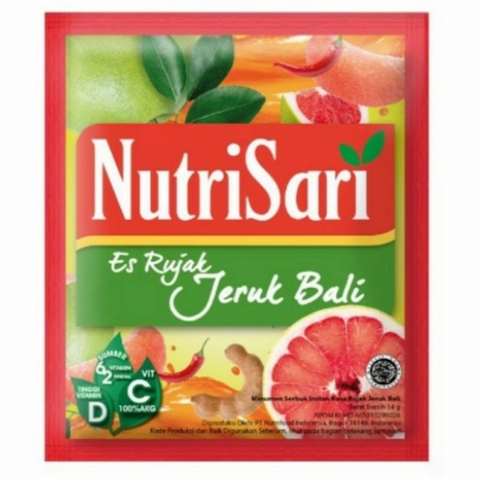 NutriSari Es Rujak Jeruk Bali merupakan minuman serbuk rasa es rujak jeruk bali dengan rasa manis asam segar yang nikmat, kombinasi dari jeruk bali yang diracik dengan asam Jawa & sensasi pedas.