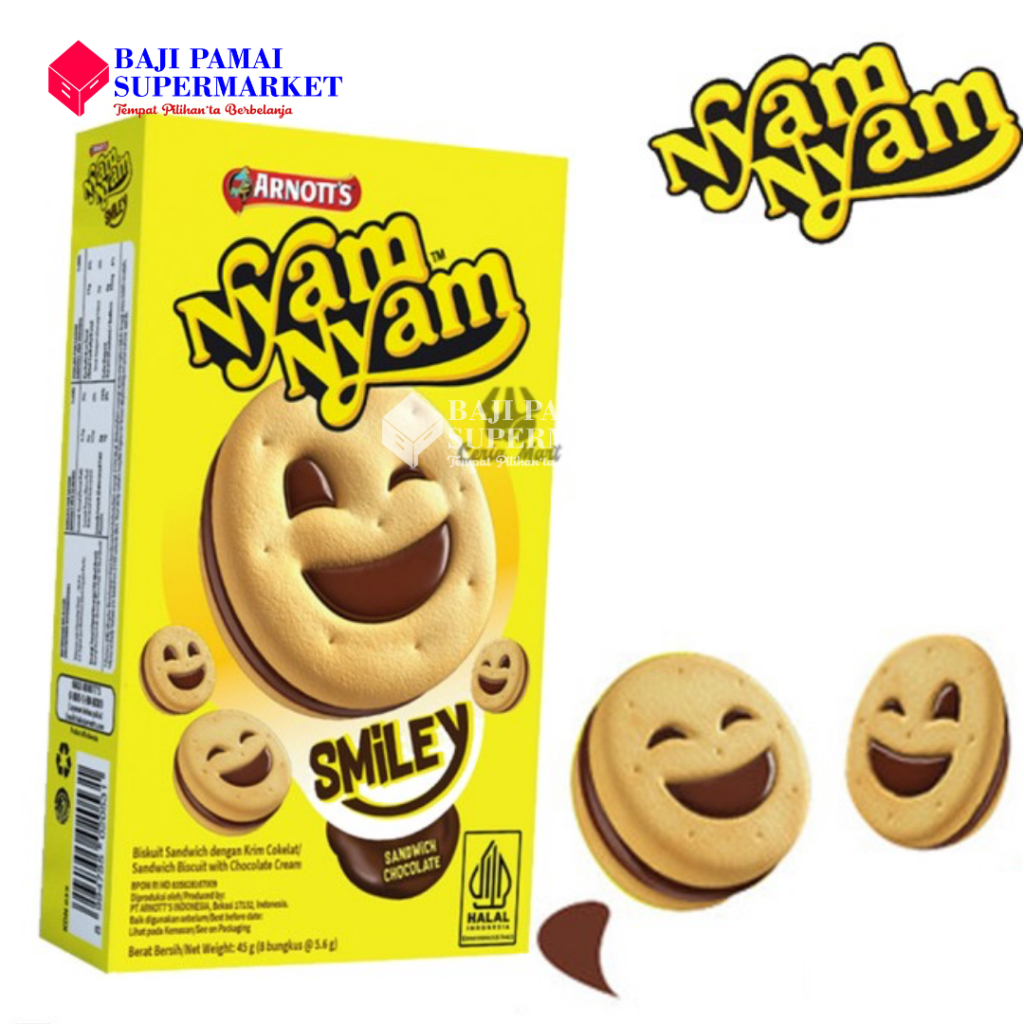 Nyam Nyam Smiley hadir dengan bentuk biskuit yang menarik serta terdapat pesan lucu disetiap kemasannya, ayo cobain!