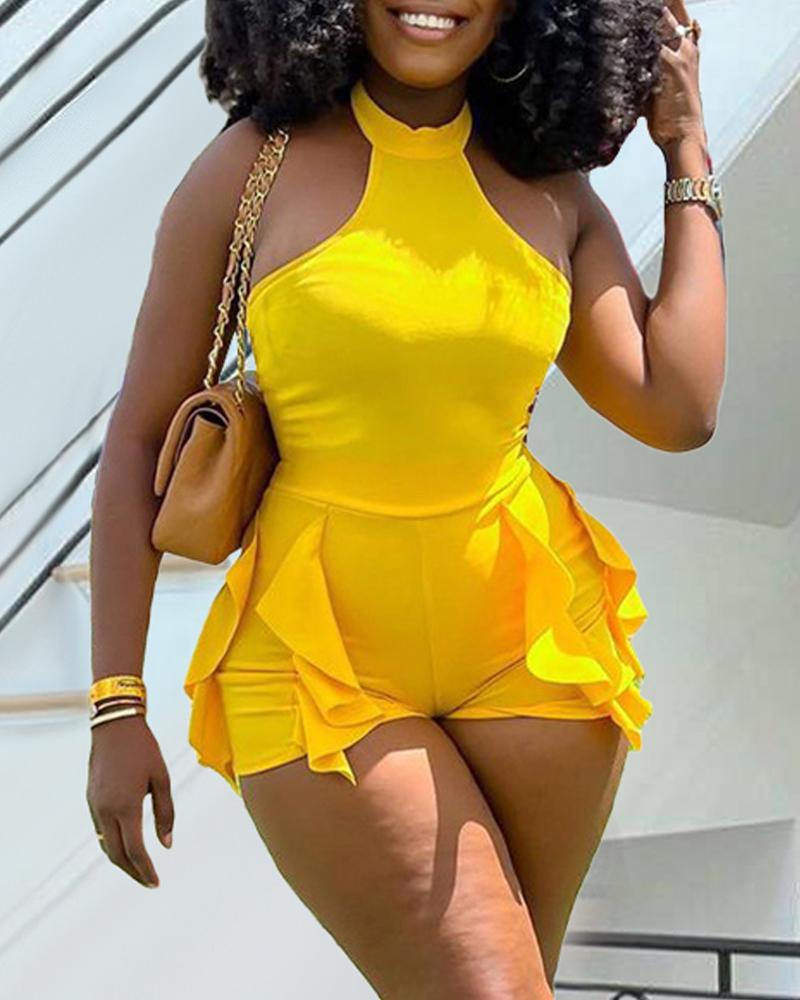 O-Neck Sleeveless Ruffle Hem Romper, Yellow