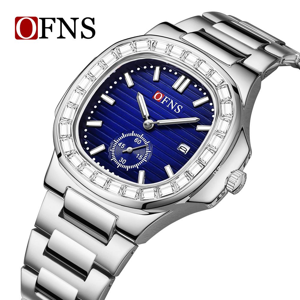 OFNS Женские кварцевые роскошные часы Модные квадратные водонепроницаемые часы-календарь с ремешком из нержавеющей стали серебряный/синий