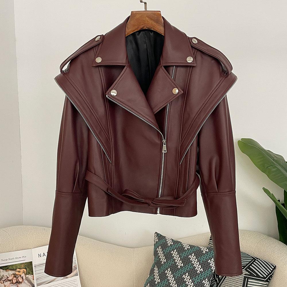 OFTBUY Женская винтажная свободная короткая куртка из натуральной кожи с поясом-манжетой, мотоциклетная куртка, женская молния, ретро-байкерское пальто, верхняя одежда, топы S красный