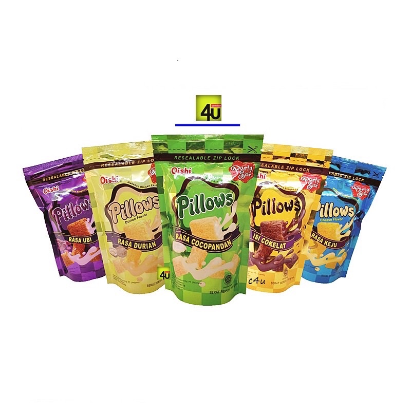 Salah satu produknya adalah Pillows, cemilan dari ekstrudat renyah berbentuk bantal dgn berbagaivarian cream isi yg enak. Berkemasan pouch tebal dgn netto 100gr, cukup banyak isinya dgn harga yg murah. Cemilan manis ringan yg cocok buat anda menemani saat2 santai bersama keluarga. Beratribut BPOM RI dan Halal MUI, silahkan diorder :).