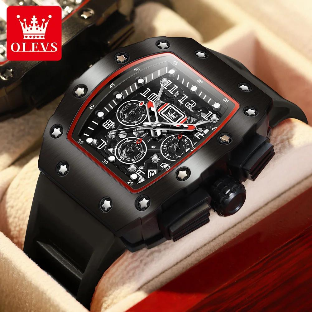 OLEVS Силиконовый ремешок водонепроницаемые мужские наручные часы в форме бочки большой циферблат спортивные кварцевые часы светящийся хронограф календарь часы чёрный