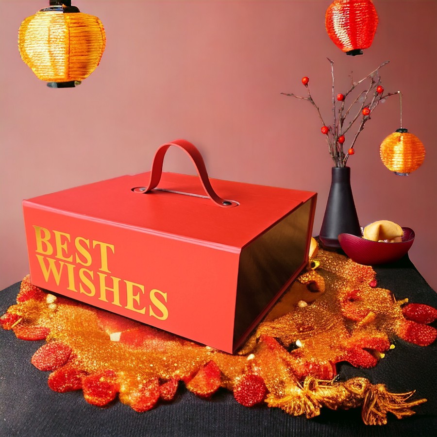 Box rigid dengan handle leather, cocok dipakai untuk bingkisan imlek atau nikahan atau ulang tahun. Hadir dengan tulisan Best Wishes dengan gold print.