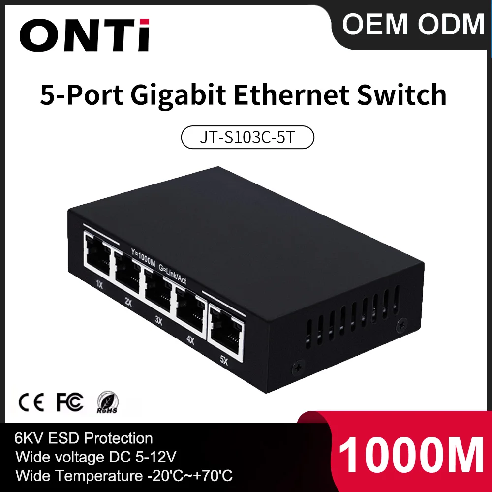 ONTi 5 Ports Gigabit Ethernet Switch Full Metal Case 1000M Network Switch 6kV ESD Protection Smart RJ45 Hub Internet Injector