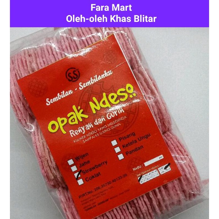Opak gambir ndeso bentuk keping yang terbuat dari bahan pilihan menghasilkan rasa yang gurih renyah paduan dari kelapa, tepung ketan, gula pasir dan wijen.