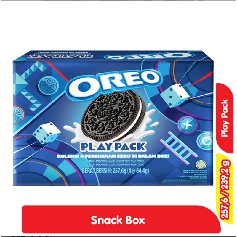 OREO Play Pack Snack Box Set adalah sebuah paket persembahan dari OREO yang berisi 2 pcs biskuit OREO dengan hadiah gratis berupa kotak snack lucu. Dalam satu paket terdapat dua biskuit OREO dengan rasa berbeda yaitu OREO biskuit cokelat dan OREO biskuit vanilla yang merupakan makanan ringan berupa biskuit coklat isi. Dibuat menggunakan bahan bahan pilihan berkualitas dan resep rahasia yang telah melegenda, membuat biskuit ini memiliki rasa yang lezat. Biskuit cokelat isi berwarna hitam pekat dengan isian krim vanilla dan krim cokelat di antaranya, memberikan perpaduan rasa manis yang nikmat. Memiliki tekstur biskuit yang renyah dan isian krim yang creamy menghasilkan perpaduan tekstur nikmat. Dicetak dalam bentuk bulat yang pas dalam satu gigitan. Akan lebih nikmat jika dikonsumsi bersama dengan susu sebagai topping celupan untuk biskuit. Susu yang meresap kedalam biskuit semakin menambah citra rasa nikmat dari biskuit. Cocok dijadikan cemilan untuk semua kalangan, mulai dari anak anak hingga orang dewasa. Dikemas secara khusus dengan terdapat hadiah special didalamnya. Beli OREO Play Pack Snack Box Set untuk anak dan keluarga anda.