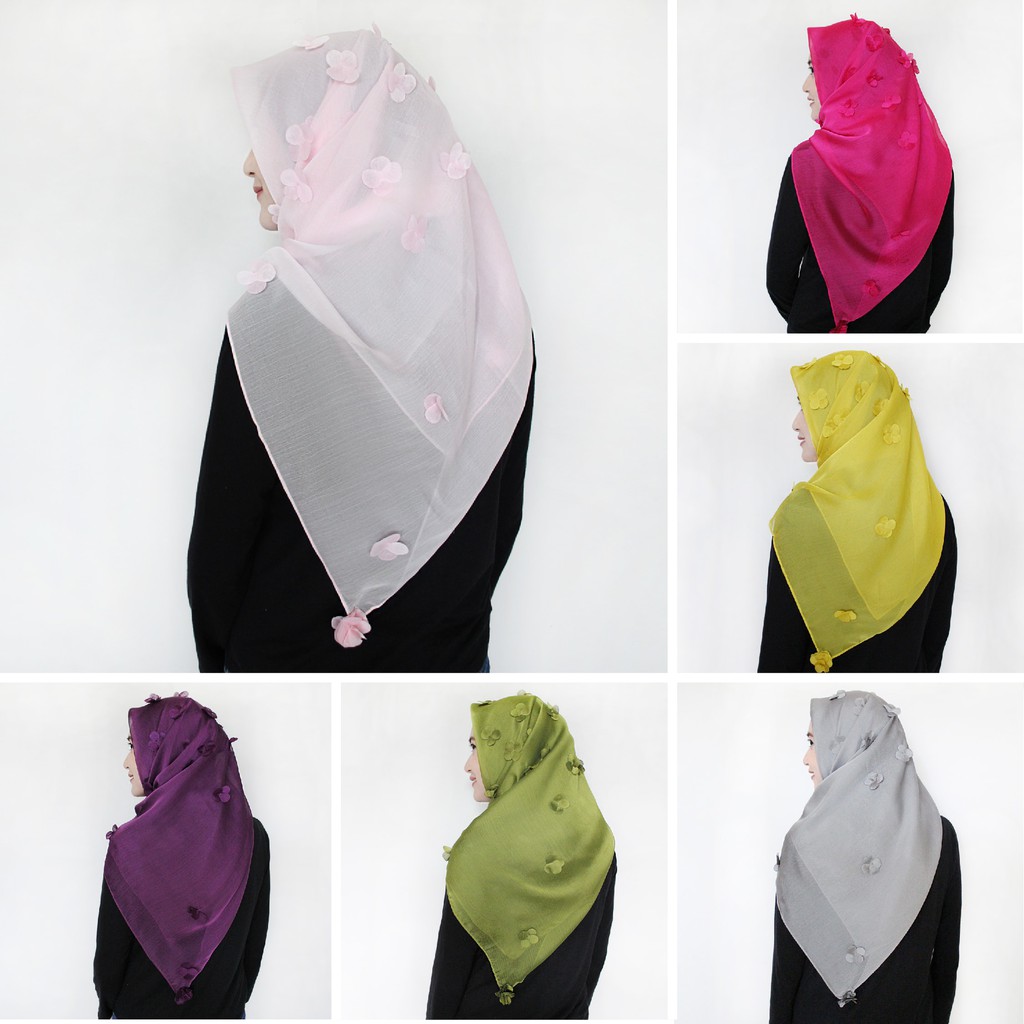 Tampil glamor dengan hijab segi empat berbahan organza. Dengan motif bunga tempel yang cantik. Cocok untuk dikenakan ke acara formal ataupun pesta.