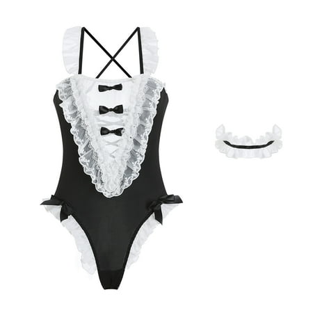 TFDZ Womens Lingerie Women Lingerie Ladies Fashion Sexy Lingerie Lace Flowers Hollow Sexy Suspenders See-through Maid Uniform Jumpsuit Black