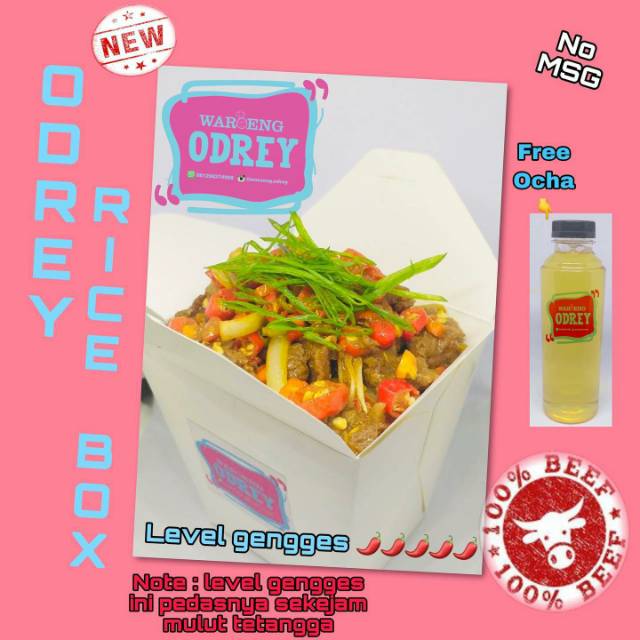 Yg baru dari waroeng odrey nih.. odrey rice box, ada 3 varian. Level santai shay, Level alemong dan yg ini Level "Gengges" wajib coba gengs.. dan ini free ocha lho gak kalah kok sama yg udah ada #waroengodrey #menubaru #homemade #beef #beefyeriyaki #superpedas #levelsantaishay #levelalemong #levelgengges
