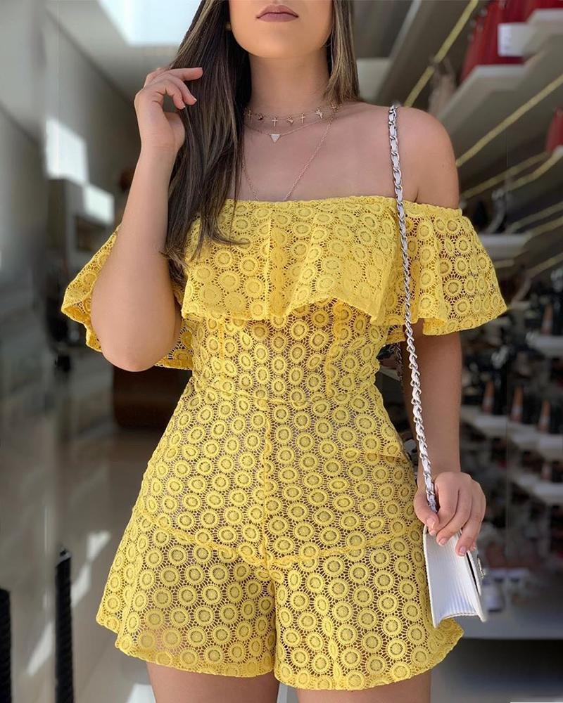 Off Shoulder Eyelet Embroidery Ruffles Romper, Yellow