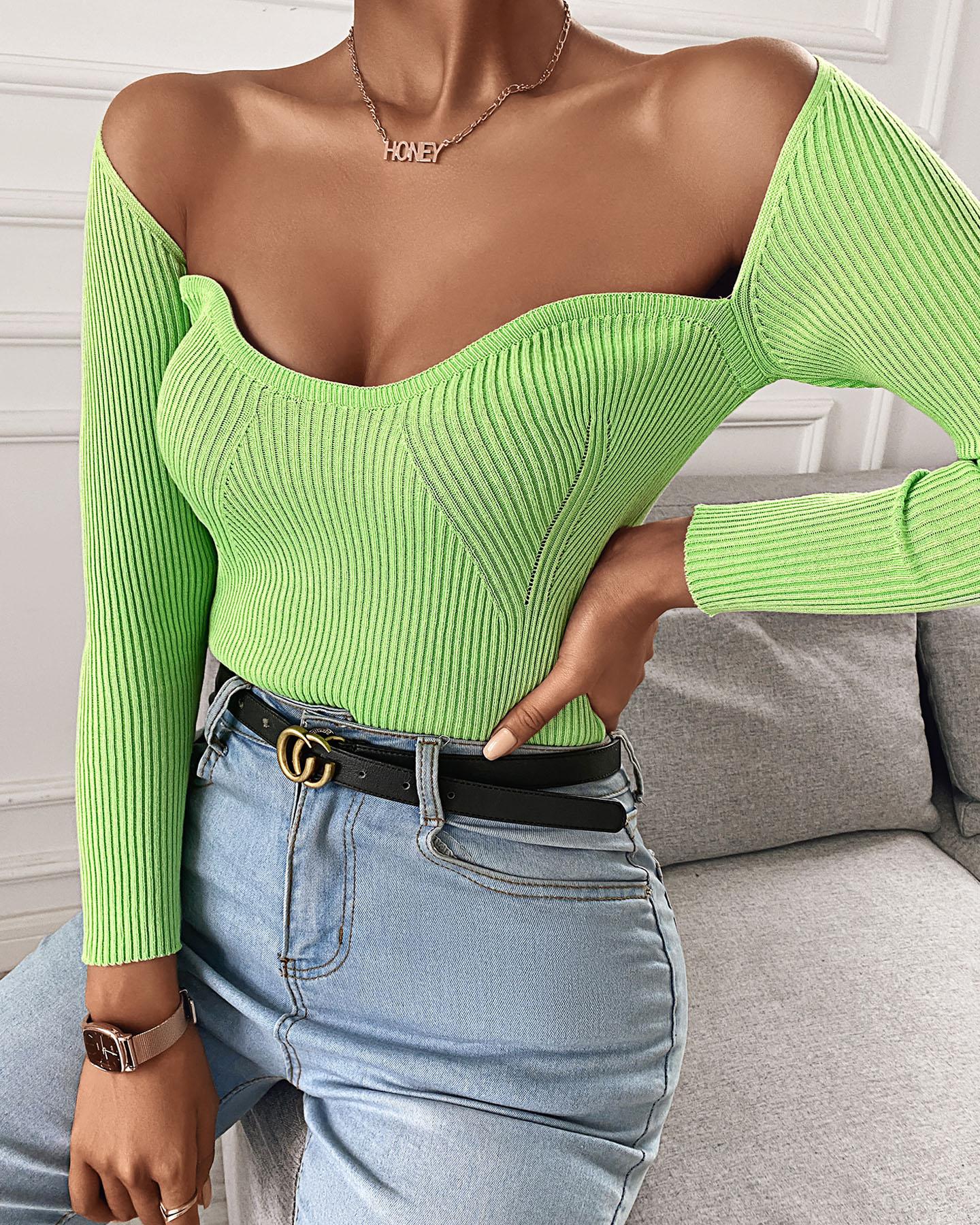 Off Shoulder Ribbed Plain Sweater, Green