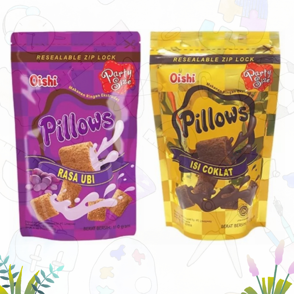 Oishi Pillows adalah satu-satunya camilan modern yang rasanya membuat para penikmatnya penasaran. Cemilan ini sudah menggoda hanya dengan melihat kemasannya. Spon renyah-lembut yang dibuat dari jagung dan beras dilumuri dengan lelehan cokelat yang membuat cokelat meresap dan terkunci dalam pori-pori spon-nya.